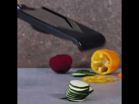 Con la nuova mandolina regolabile a V è possibile tagliare frutta, verdura e formaggi in modo veloce, preciso e senza il minimo sforzo. Oltre a tagliare gli alimenti in fette, grazie all’inserto julienne si possono creare listarelle lunghe e sottili dello spessore desiderato. Per seguire una ricetta oppure dare sfogo alla creatività, l’affilatissima lama a V e gli altrettanto affilati dentini julienne permettono di dare ogni volta la forma desiderata a carote, zucchine, cetrioli, peperoni, mele, pere, arance e tanto altro. Passare dal taglio a V a quello julienne è semplicissimo grazie al piano di taglio reversibile. Inoltre è possibile regolare lo spessore del taglio da sottilissimo a spesso con la manopola retrostante. È possibile grattugiare gli alimenti fino all’ultimo pezzo salvaguardando le mani grazie al proteggi-dita incluso. Il piedino in gomma antiscivolo permette di utilizzare la mandolina a V su qualsiasi piano di lavoro senza lasciare graffi o scivolare, garantendo inoltre sicurezza e stabilità. I ganci alla base sono perfetti per tagliare direttamente dentro una ciotola o padella. Dopo l’utilizzo è sufficiente rimuovere il piano di taglio e lavare la mandolina sotto l’acqua corrente.